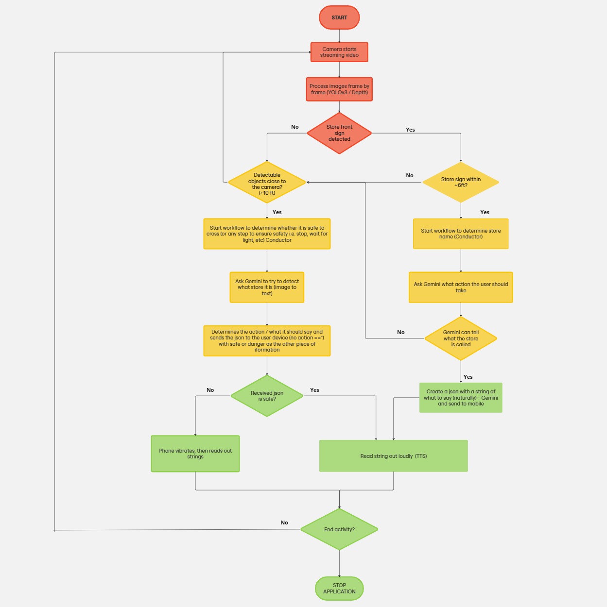 We built the backend using Python and Flask, integrated with YOLOv3 for object detection, OpenCV for image processing, and TensorFlow Lite for efficient on-device inference. Our goal was to detect crosswalks, vehicles, traffic signs, and more, delivering immediate, clear feedback to users.